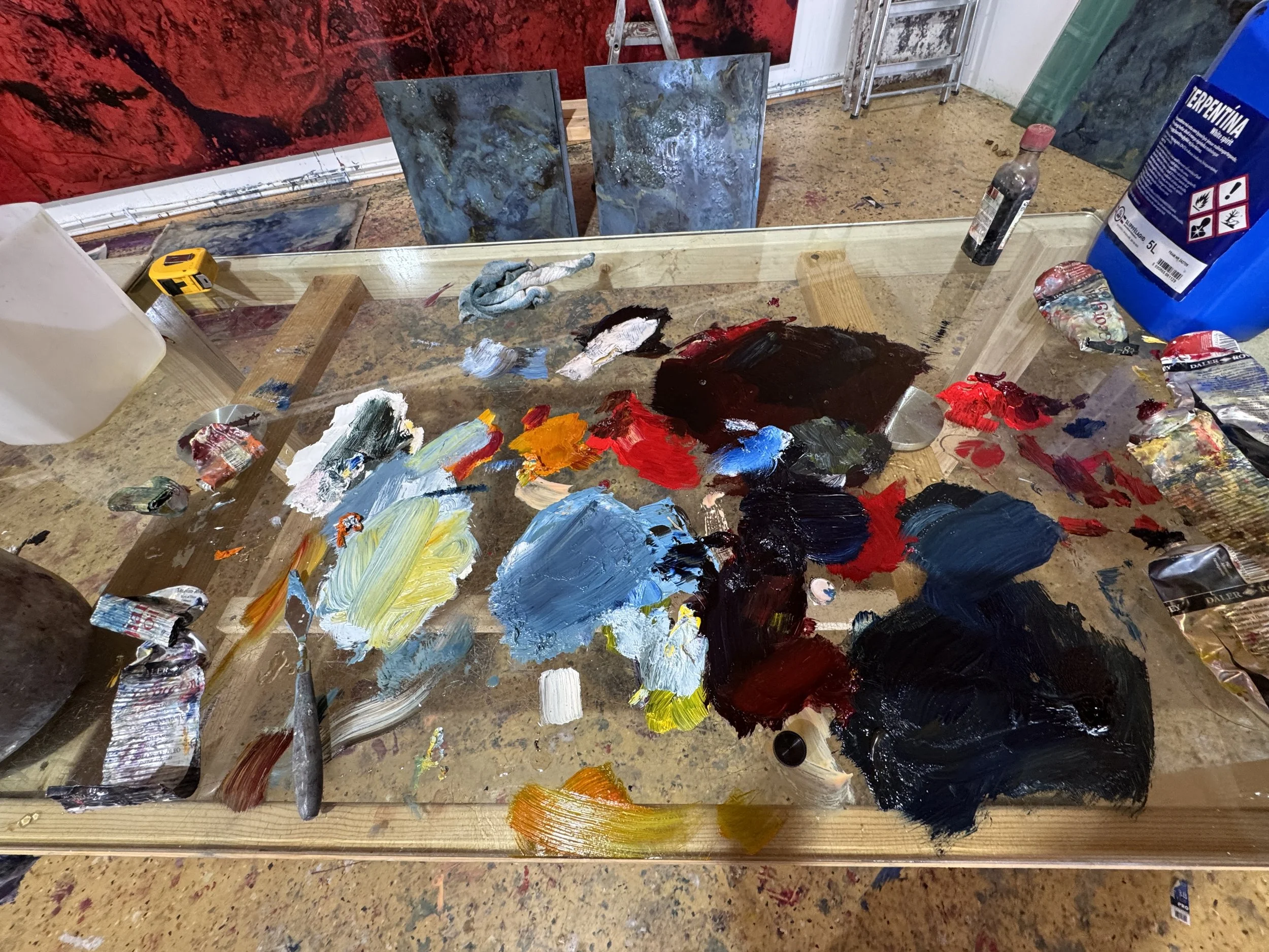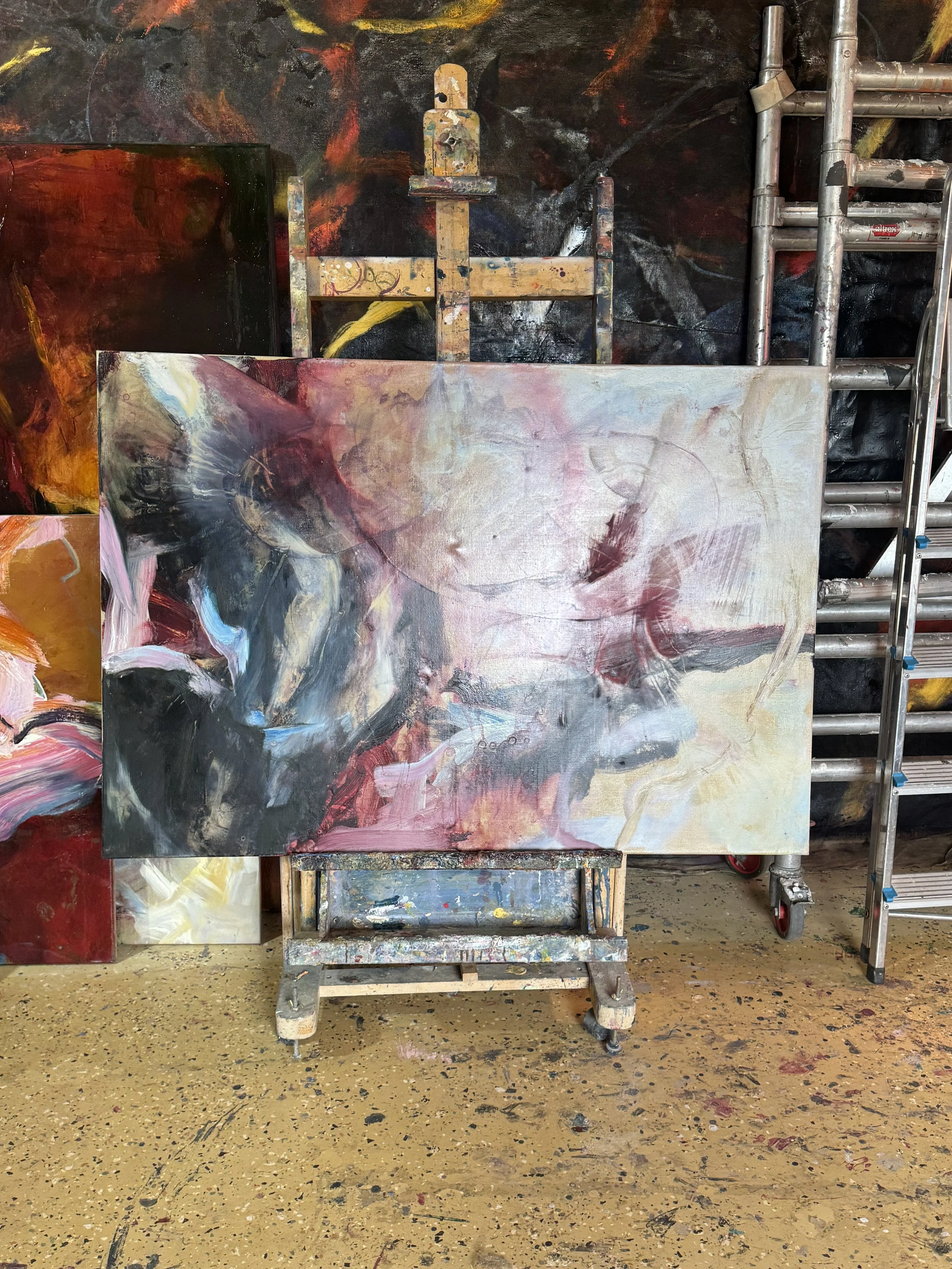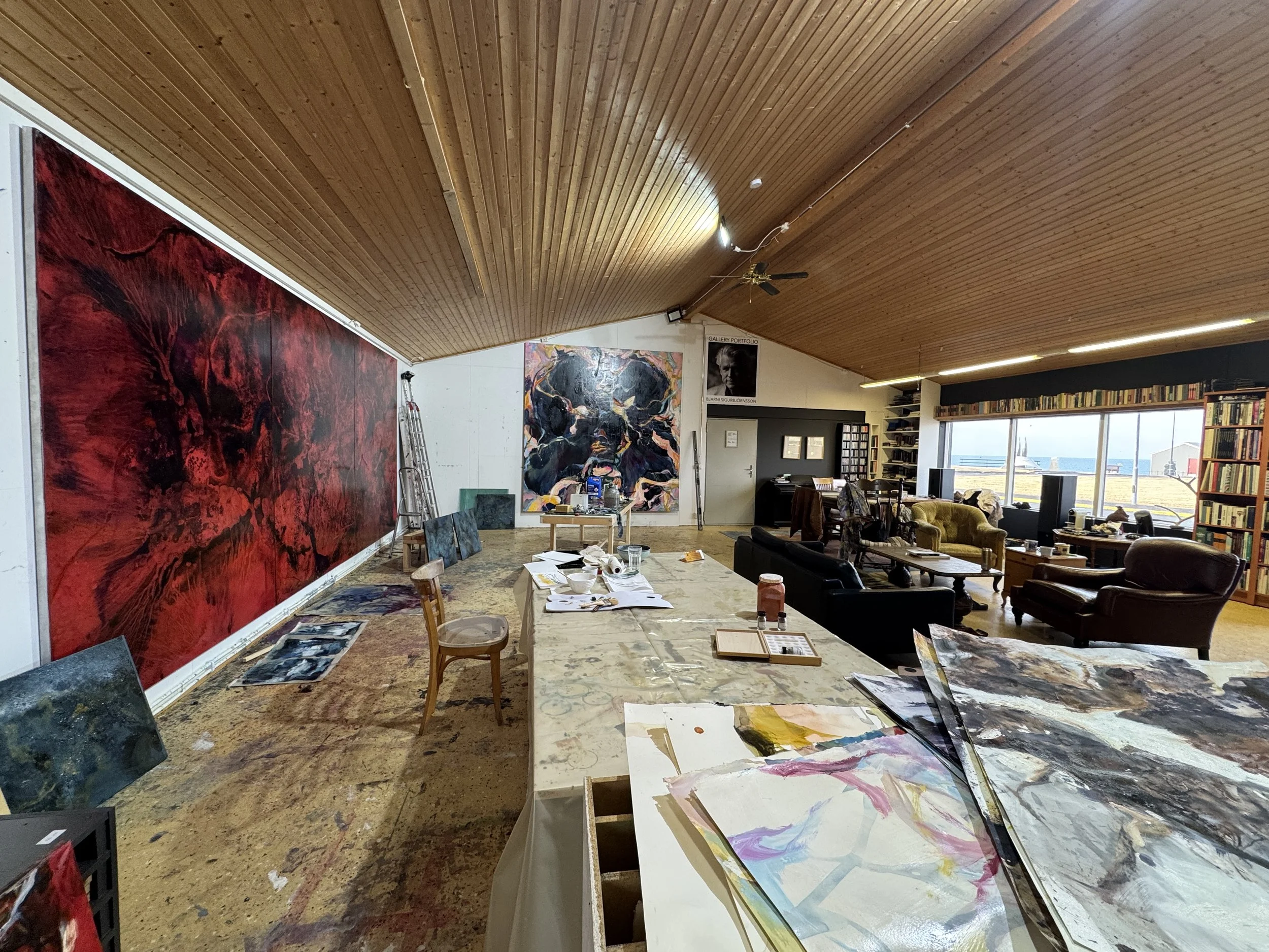 His studio becomes a sound chamber—not only filled with the operas of Wagner, but attuned to his innermost thoughts, both conscious and unconscious. The music sets a tone of intensity and movement, mirroring the shifting conditions outside. Within this charged environment, painting becomes a form of listening as much as acting—a way of registering inner and outer currents alike. His works are shaped by contrast and motion: fire and ice, density and openness, tension and release. Rather than aiming for resolution, they remain in flux—evolving fields of energy where presence is continuously negotiated.