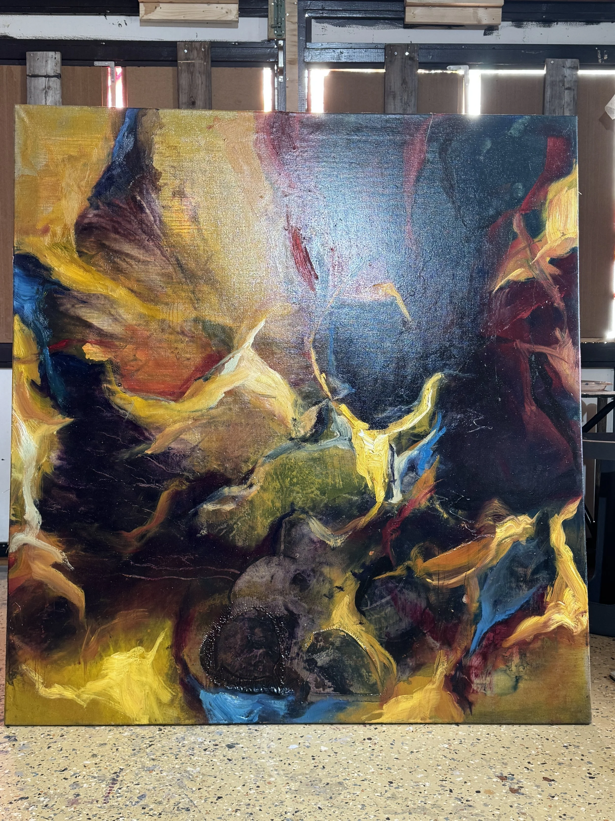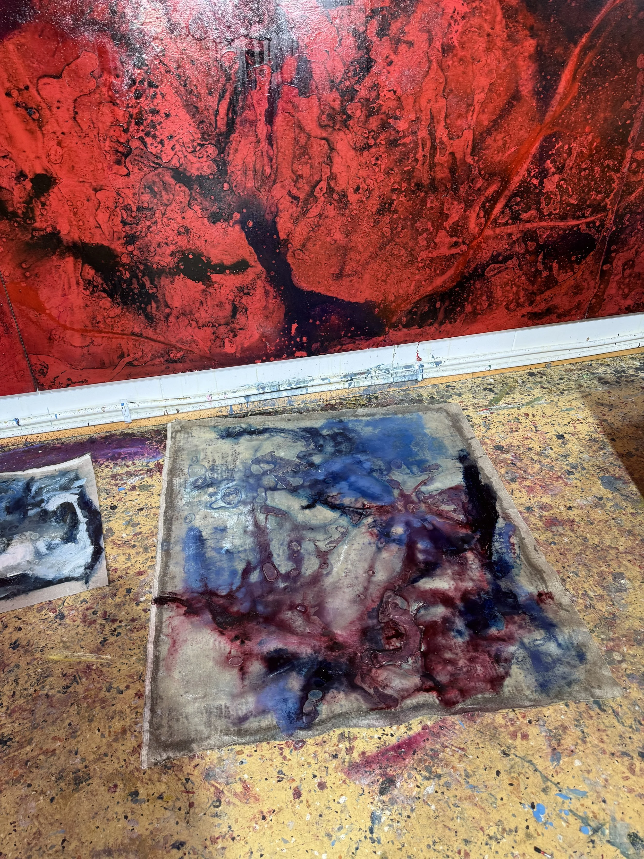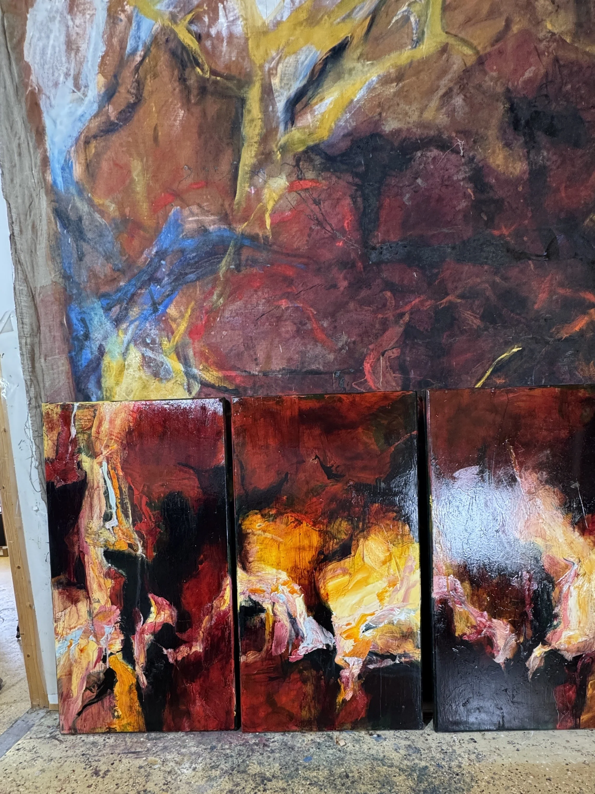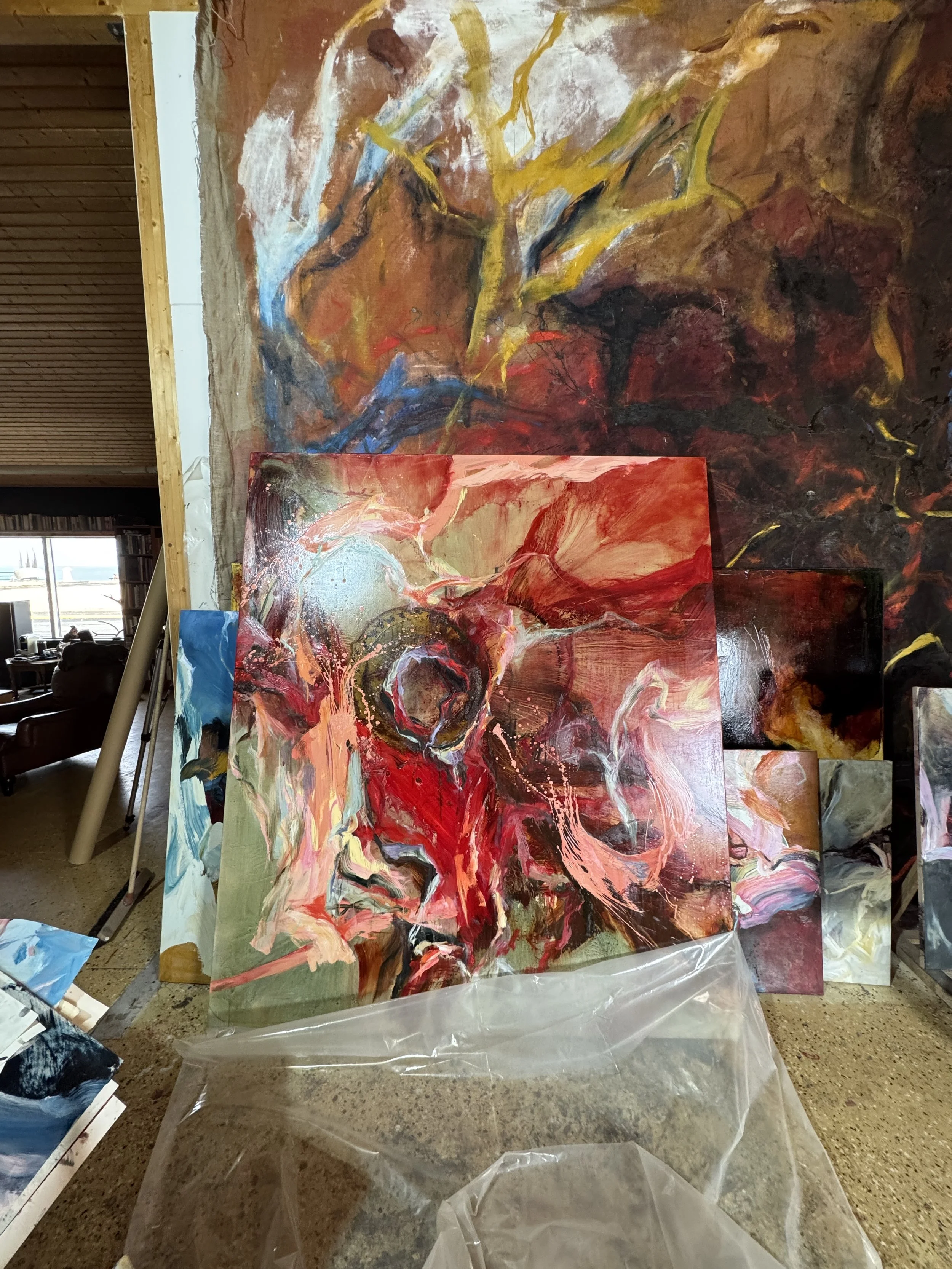 His studio becomes a sound chamber—not only filled with the operas of Wagner, but attuned to his innermost thoughts, both conscious and unconscious. The music sets a tone of intensity and movement, mirroring the shifting conditions outside. Within this charged environment, painting becomes a form of listening as much as acting—a way of registering inner and outer currents alike. His works are shaped by contrast and motion: fire and ice, density and openness, tension and release. Rather than aiming for resolution, they remain in flux—evolving fields of energy where presence is continuously negotiated.