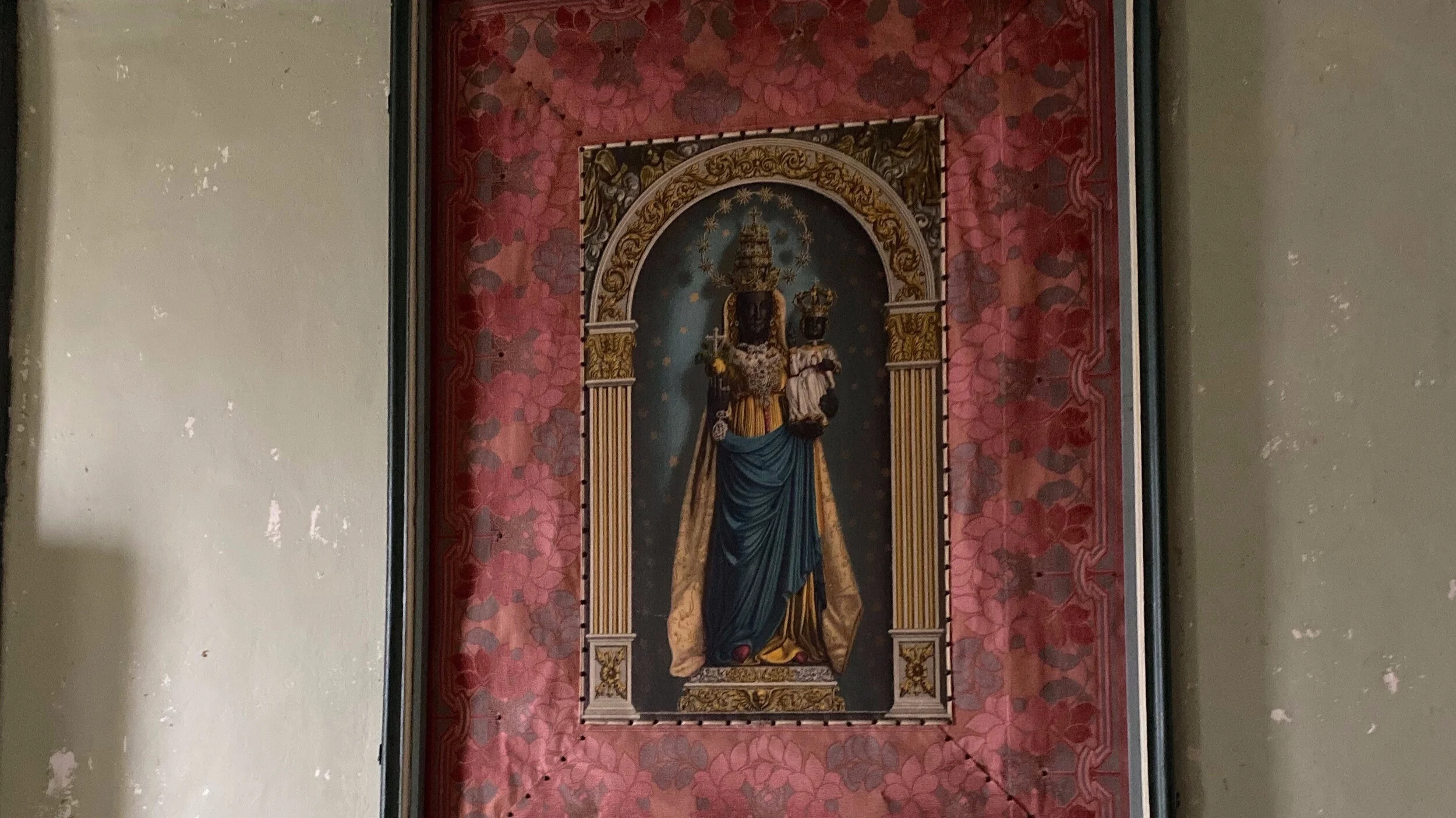 As I enter through the large iron gates, I begin to realize the vision Mikelle had when entering the compound for the first time – that it could revive itself and be an enclave that could serve as an art center and artist retreat. There was a warm welcoming feeling entering the foyer, the walls seemed to be filled with love and tales of its past residents. There is a sense of care and shelter. Each room has its own story, some with painted walls and ceilings, others with portraits of the Black Madonna or statuary of the Virgin Mary. Scenes of painted birds on the ceilings are another common theme in the building. Once Mikelle opened the turquoise shutter to each room, there was a magnificent natural light source that inhibited the space. Standing there, an awakening came to me, as if each room seemed to have a treasure trove of secrets to unveil.
