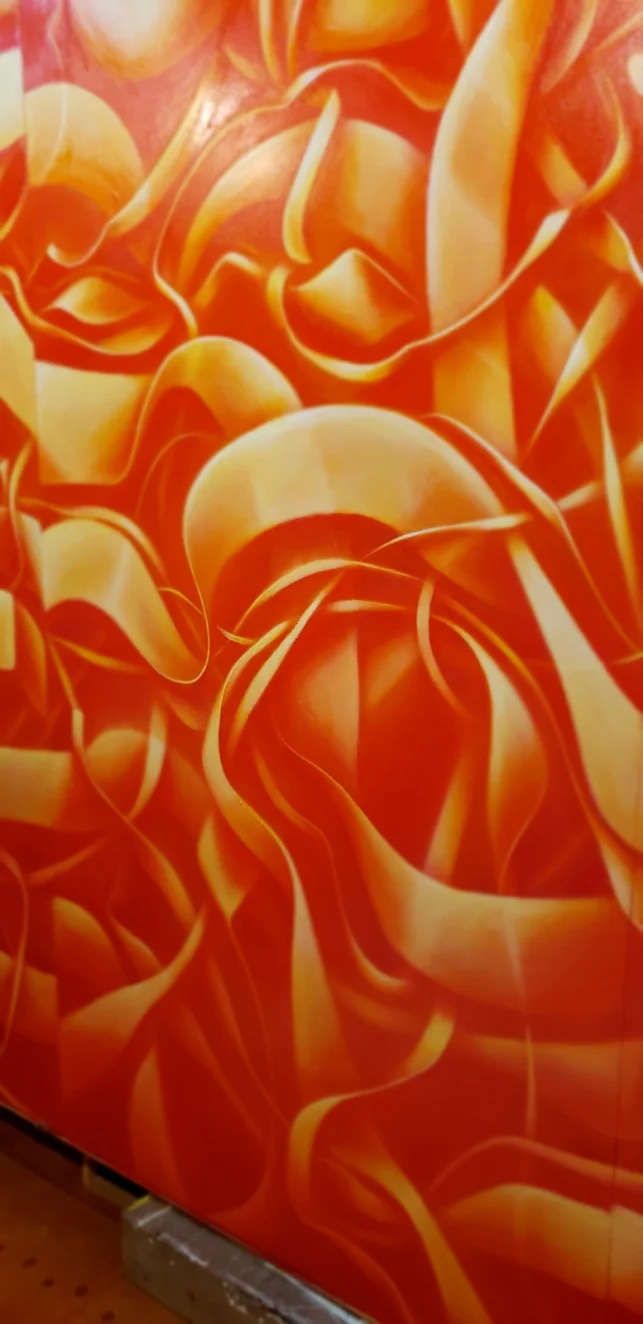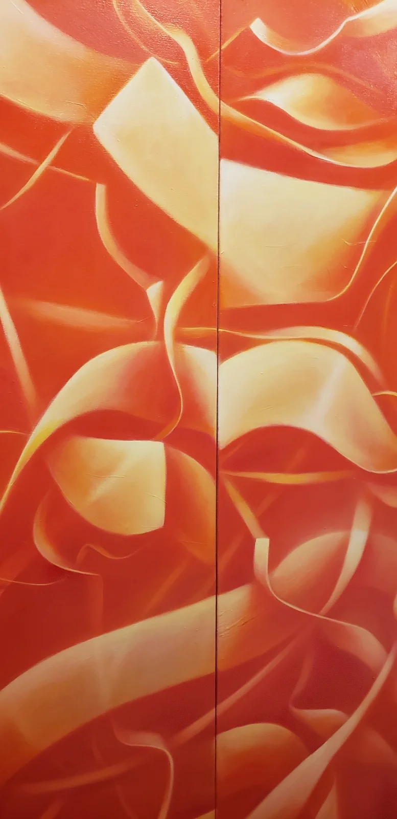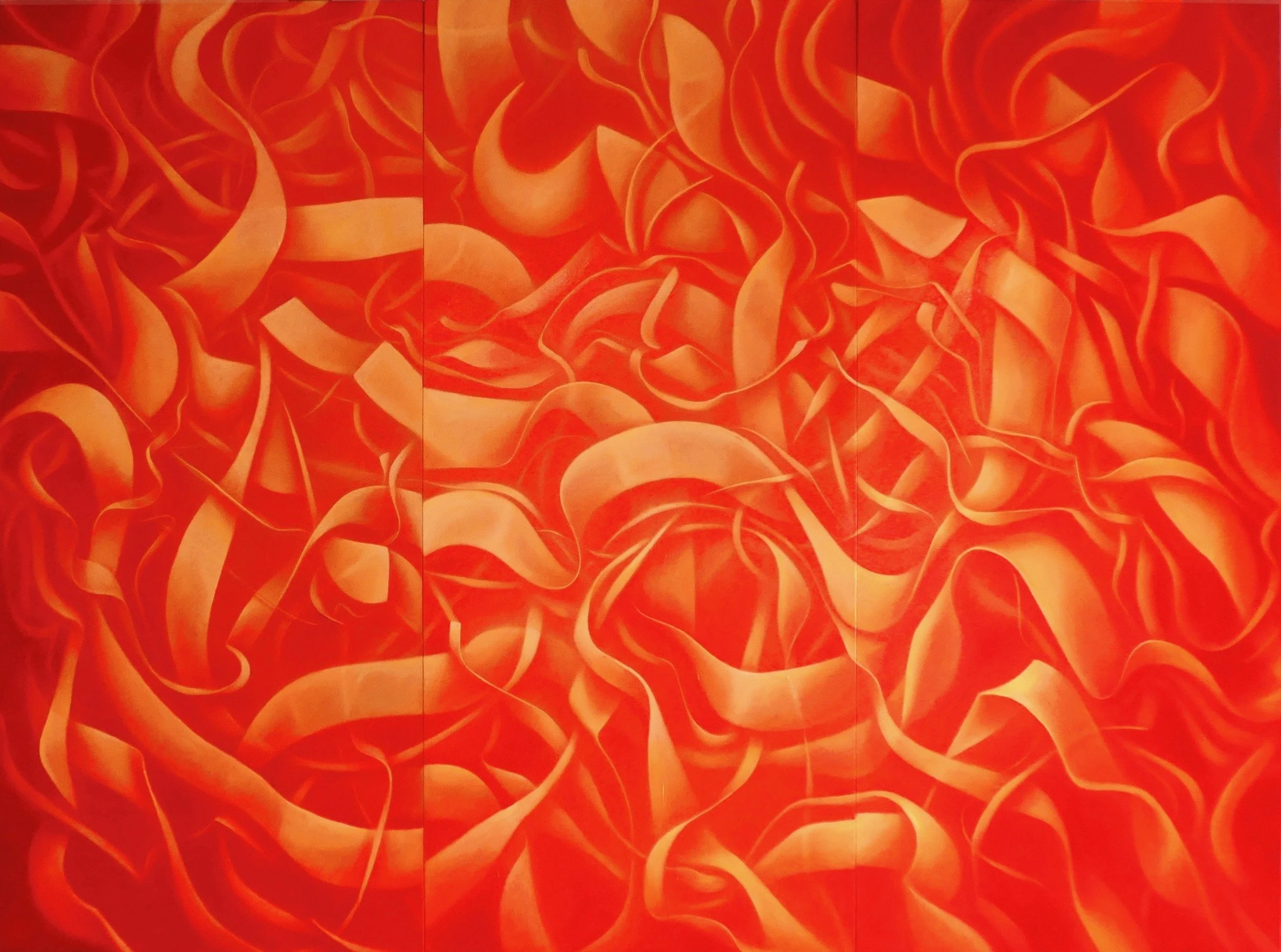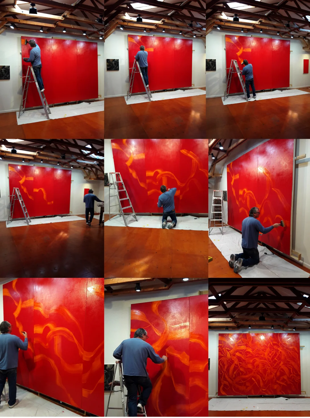 Shane Guffogg: “This painting is bigger than me, in more ways than one. The size was dictated by my own physicality and what I am able to physically work on. The second part was the size of my studio – its the biggest I can go in that studio. The canvases are 9 feet tall, I am just shy of 6 feet tall and with my hand stretched high over my head, I cannot reach the top. This means I was up and down a ladder a lot of the time. But this size allows me to fully stretch my arm and make gestures withthe brush that are truly connected to my own physicality. I chose 3 panels to give me 3 surfaces to work on. And what that does is give me 3 distinct moments to explore. Each panel is like a picture frame or film cell. In the western world, we read from left to right and I worked on this painting in the same way. I started with a large brush, loaded with paint, and climbed the ladder to the left upper corner and began. As my brush went across the canvas, the panels served as a new surface that could be a continuation of the adjoining canvas or it could be a different moment in time and space. One thing that I am continuously fascinating by is patterns. The repetition of one thing creates patterns. If we could film our movement throughout the day, and it would appear as lines, what would it look like? Scientist study the movements of moths and filming them creates these beautiful, abstract lines. We all create these lines and patterns, but we don’t see them. I see them. But I digress. As one line moves to another panel, sometimes they appear as a fluid connection, sometimes disjointed and other times, the line is interrupted. I think about our lives and how we live in a moment, a day, a week, a year. What gets passed along from one day to the next? And how about generations? What have I picked up from my parents? What has my son picked up from me? Most people tend to think of time as linear, but I don’t. I think of time as a perception that is relative to each person. This painting was not preconceived – it happened at the moment it was started. The actual laying out of the lines took maybe an hour. I had my son film and photograph that hour. When I had that part of it completed, I was mentally and physically wiped out. It summoned everything I had – it was my past, present and future. Those first movements were all done with a cadmium orange over a medium cadmium red. The following day began the journey, where I started to define the pictorial space by painting in light and shadows, making a moment in time my subject.