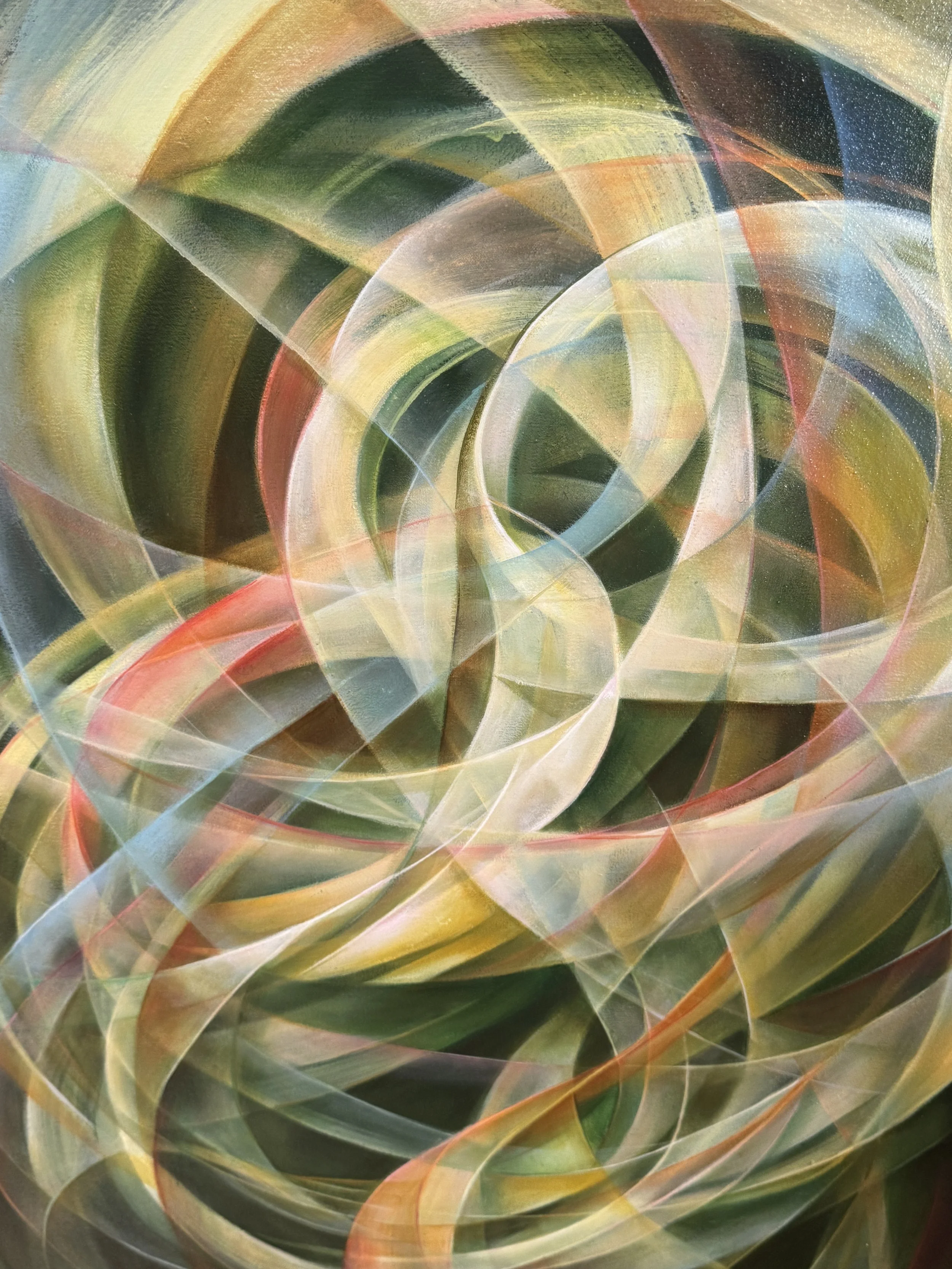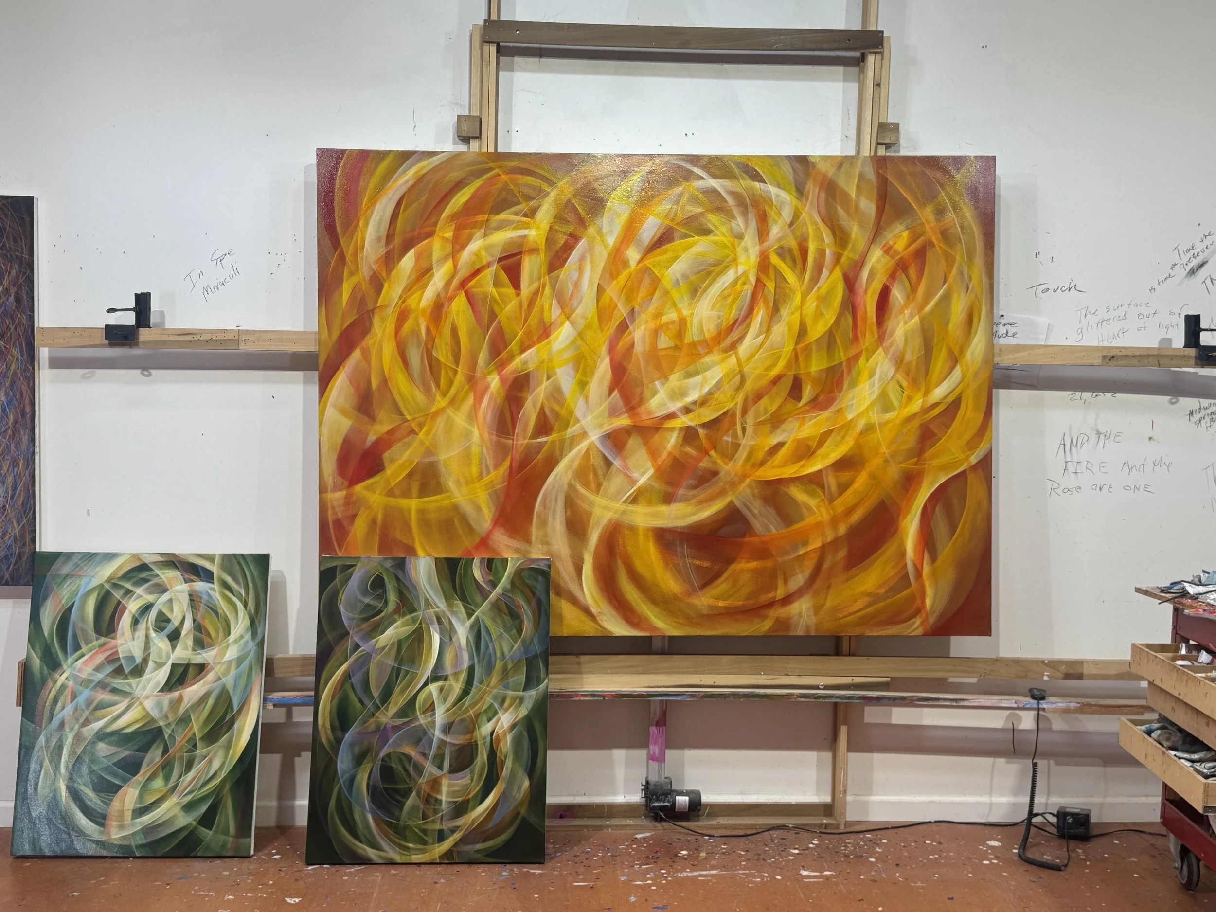 Perhaps this is why his life on the ranch feels so essential to his practice. Surrounded by vineyards, olive trees, and open farmland, he is attuned to rhythms: the swell of storms, the turning of seasons, the fertility of soil. These are the same patterns the cosmos knows, transposed to the human hand. In his paintings, ribbons of color bend and weave like refracted light waves. They are made of sound as much as pigment, for Guffogg’s synesthesia translates hue into music. Each mark carries both visual and auditory resonance, a hidden score embedded in paint.