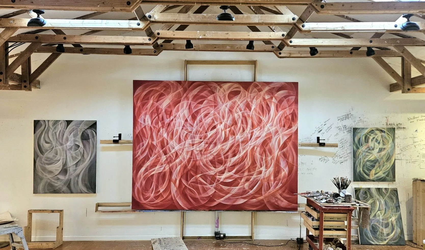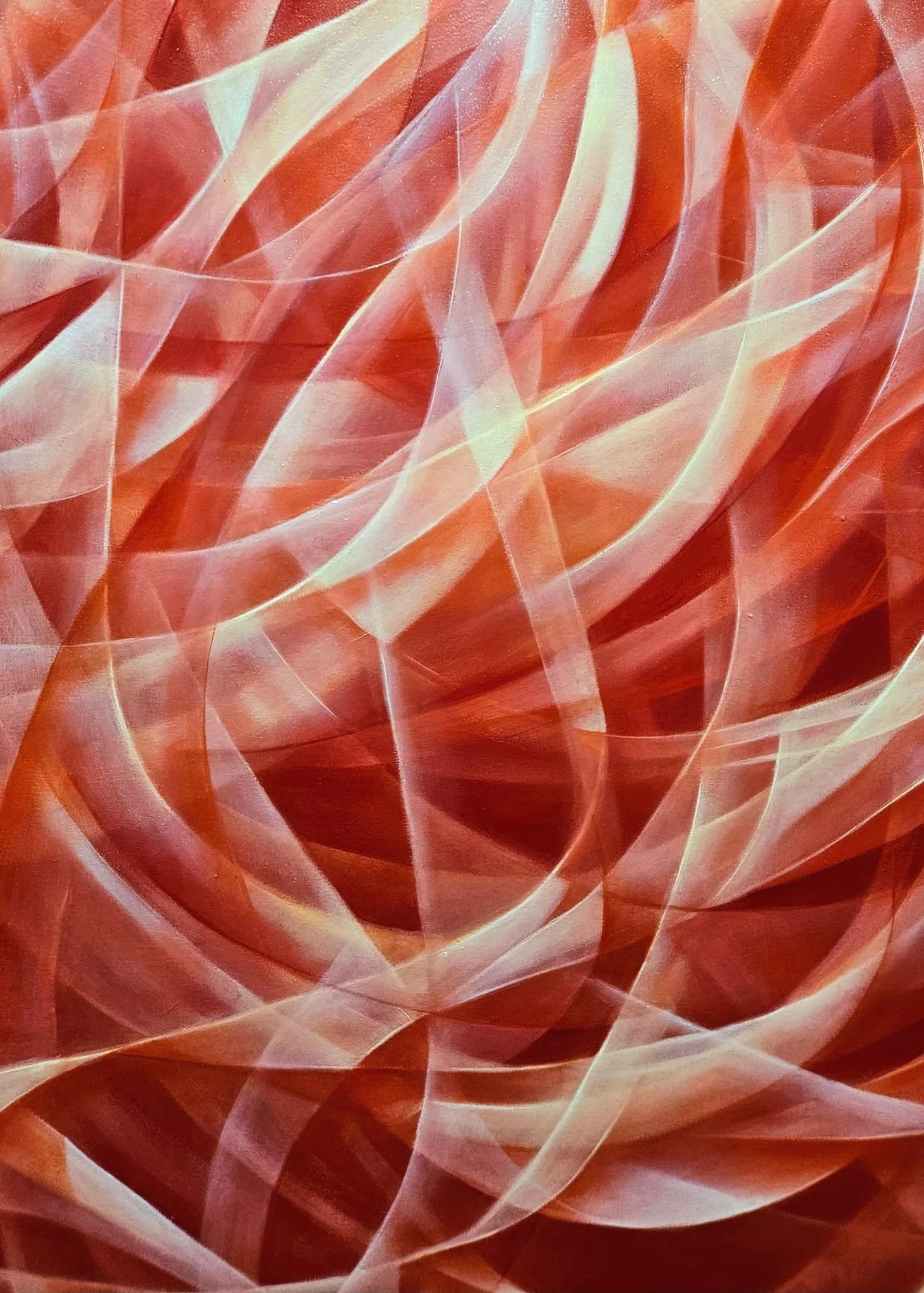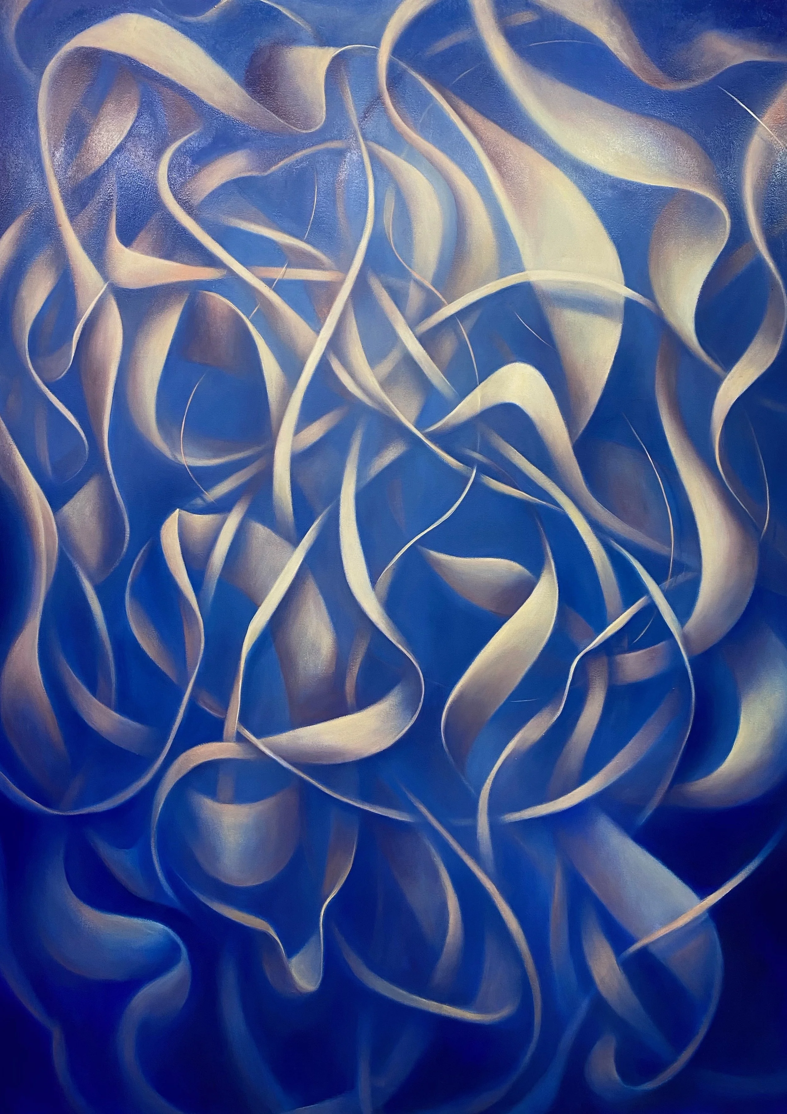 CENTRAL TO GUFFOGG’S VISUAL VOCABULARY ARE THE RECURRING MOTIFS OF UNDULATING, RIBBON-LIKE FORMS—INTERWEAVING LINES OF COLOR THAT APPEAR SUSPENDED WITHIN THE SURFACE OF THE CANVAS. THESE FORMS, FAR FROM ARBITRARY GESTURES, FUNCTION AS MEDITATIONS ON INFINITY, MOTION, AND THE EPHEMERAL. THEY OSCILLATE BETWEEN PRESENCE AND ABSENCE, STRUCTURE AND DISSOLUTION, THEREBY GENERATING A LIMINAL SPACE WHEREIN LIGHT BECOMES BOTH MEDIUM AND MESSAGE.