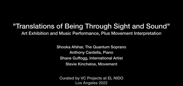 For one performance only, during the afternoon of April 23rd, 2022, from 3 to 6 pm, performance starts at 4pm, Shooka Afshar, Quantum Soprano, and Shane Guffogg, International Artist will make known their creative voices capturing the essential moment of their artistry. The event is curated by VC Projects, and will move between two rooms, where guests will not only hear a vocal performance but also view works of art that are related to sound.