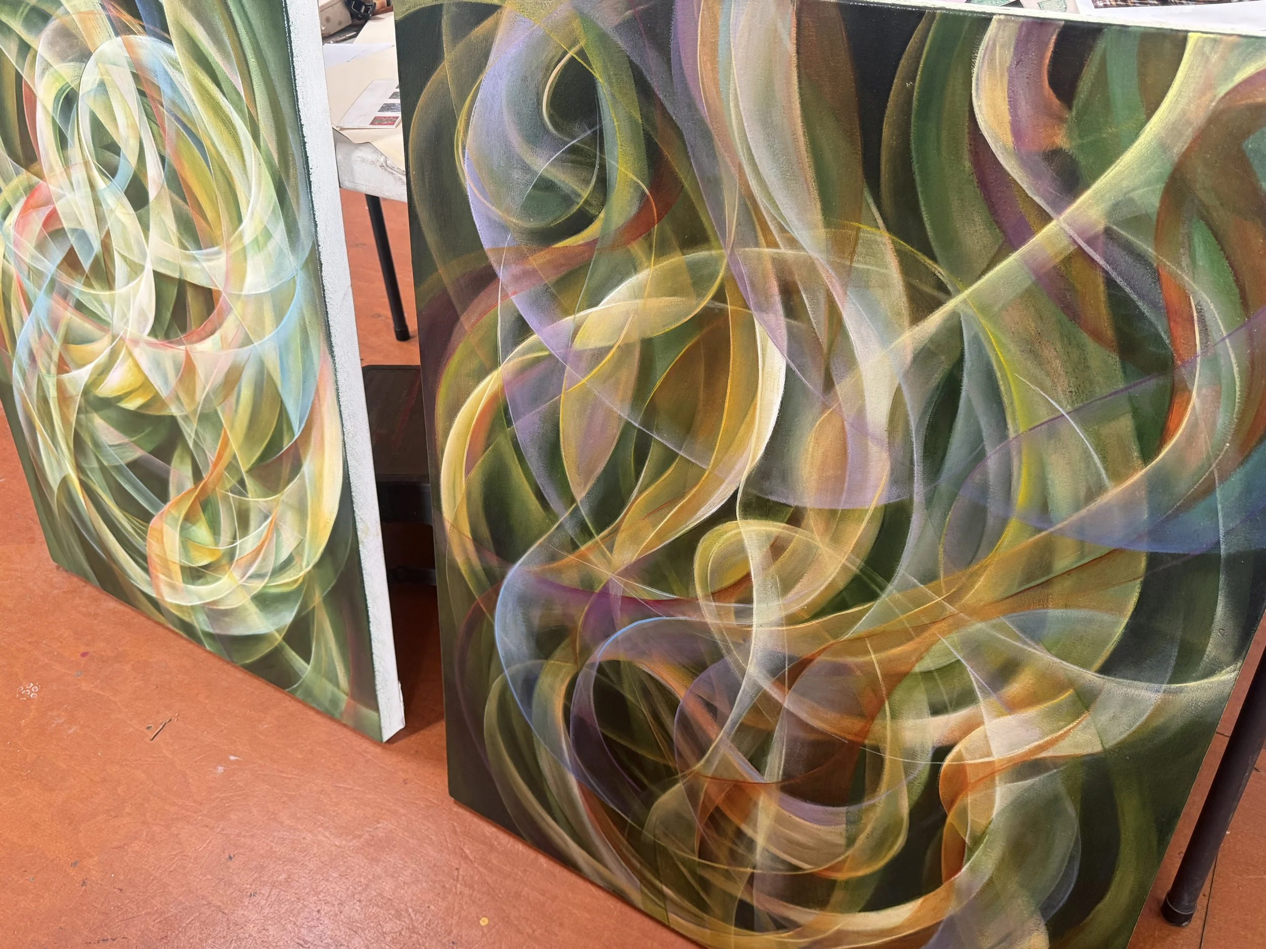 Standing before these paintings, I thought about what Guffogg had shared with me—that he had been thinking about the James Webb Space Telescope, and how its images had begun to inform this new body of work. His canvases, layered with translucent glazes, are not fixed images but portals—openings through which we peer backward, forward, and sideways in time. Unlike Cubism, which fractured perspective into simultaneous viewpoints, Guffogg fractures time itself. To look at these works is to enter a simultaneity of presence: the trace of yesterday, the shadow of today, and the shimmer of tomorrow, all trembling together on the same surface.